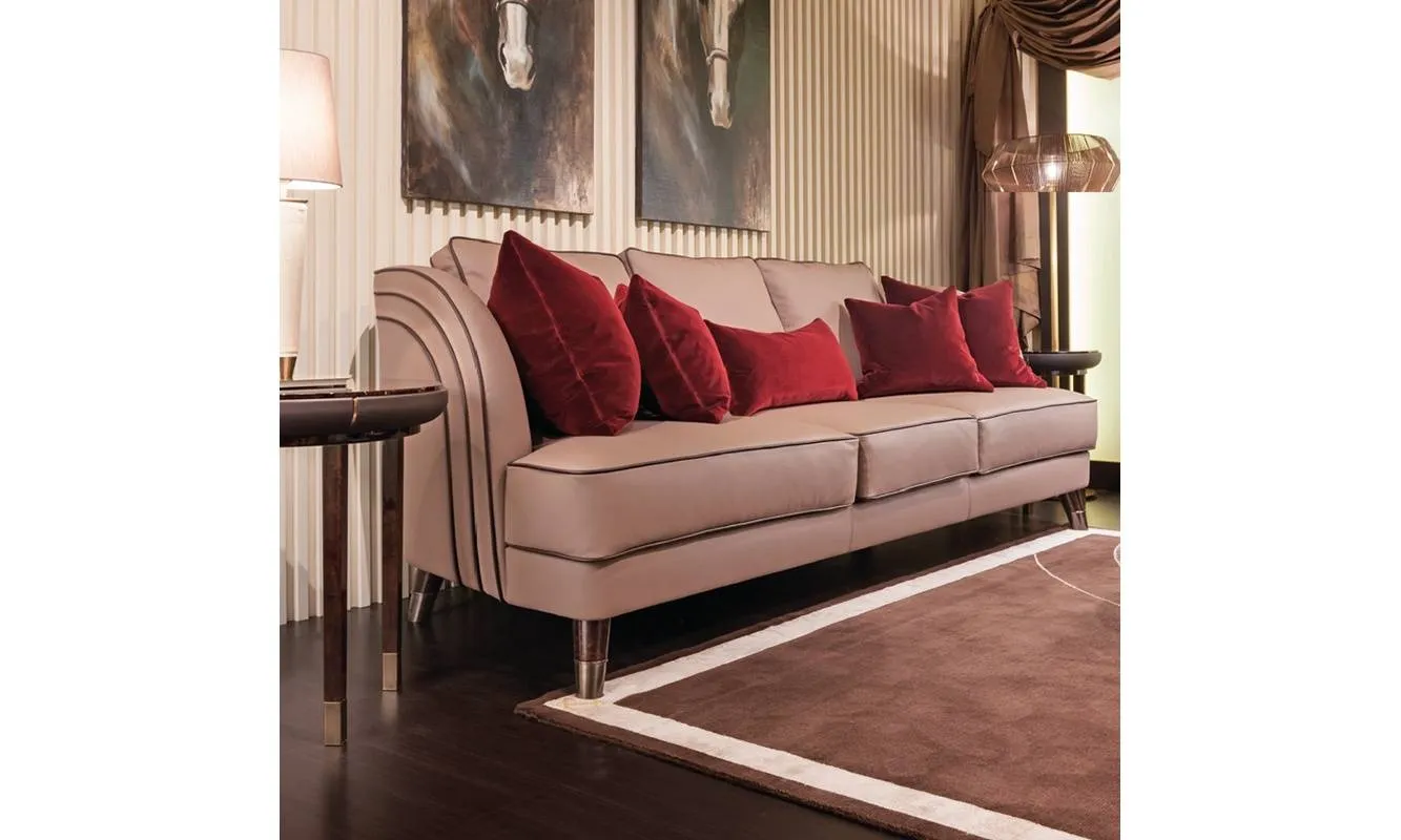 Диван на ножках из металла и ценных пород дерева. Обивка может быть выполнена из ткани или кожи разных видов.