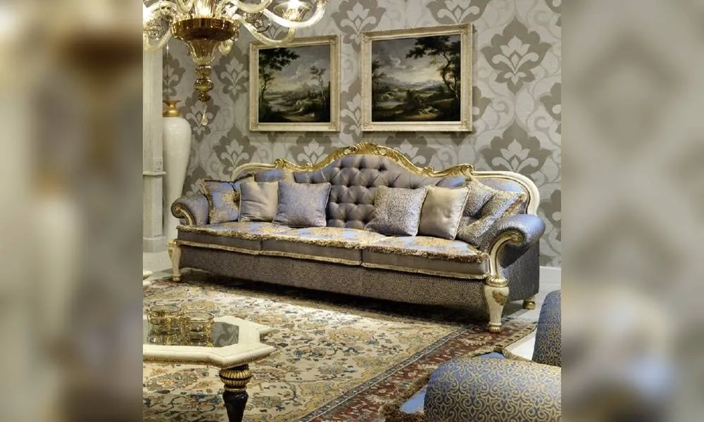 3-х местный диван. Декорирован резными элементами. Возможны другие варианты отделки и обивки.
