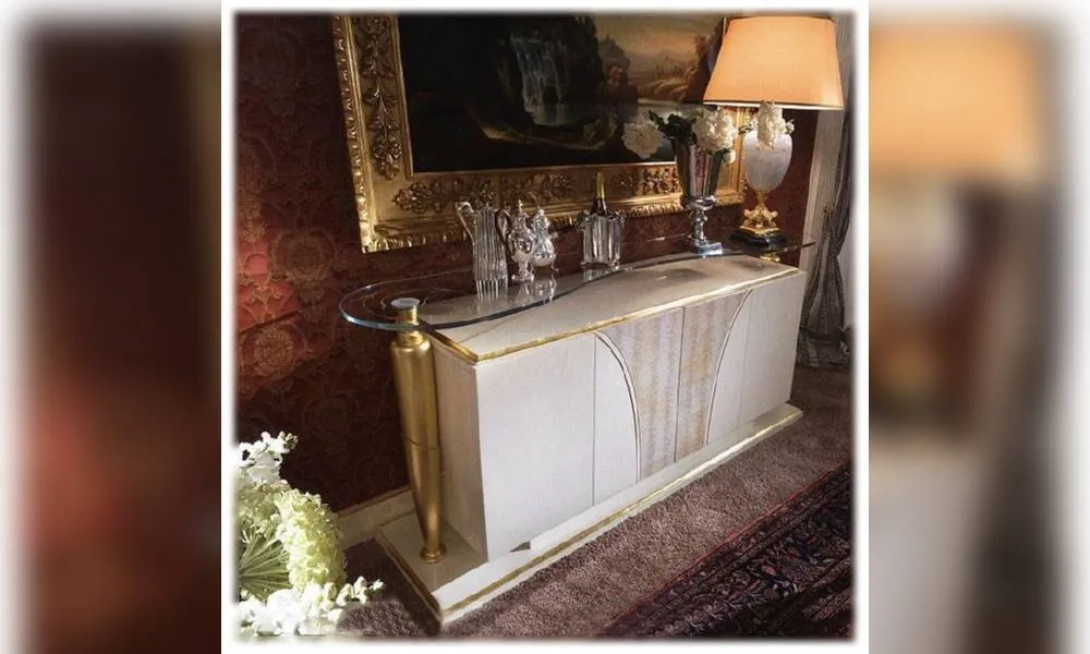 4-х дверный комод со стеклянной столешницей. Декорирован кожаной аппликацией. Декор ручной работы. Возможны другие цветовые варианты отделки.