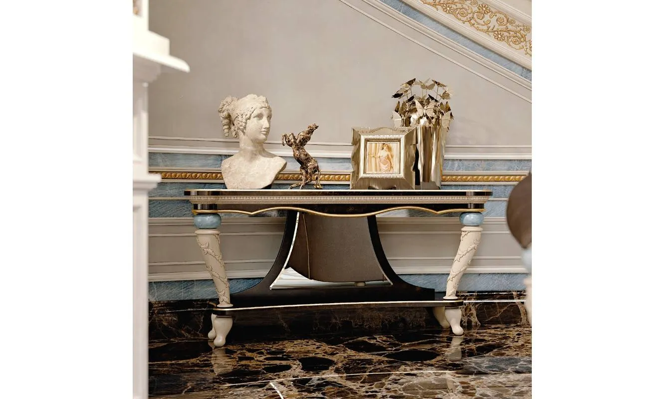 Консоль с резными деревянными ножками, декорирована сферами из мрамора. На задней панели - зеркало.