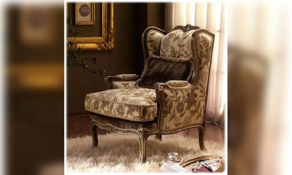 Кресло, декорированное резьбой. Обивка - ткань, наполнение - полиуретан. Возможны различные варианты обивки