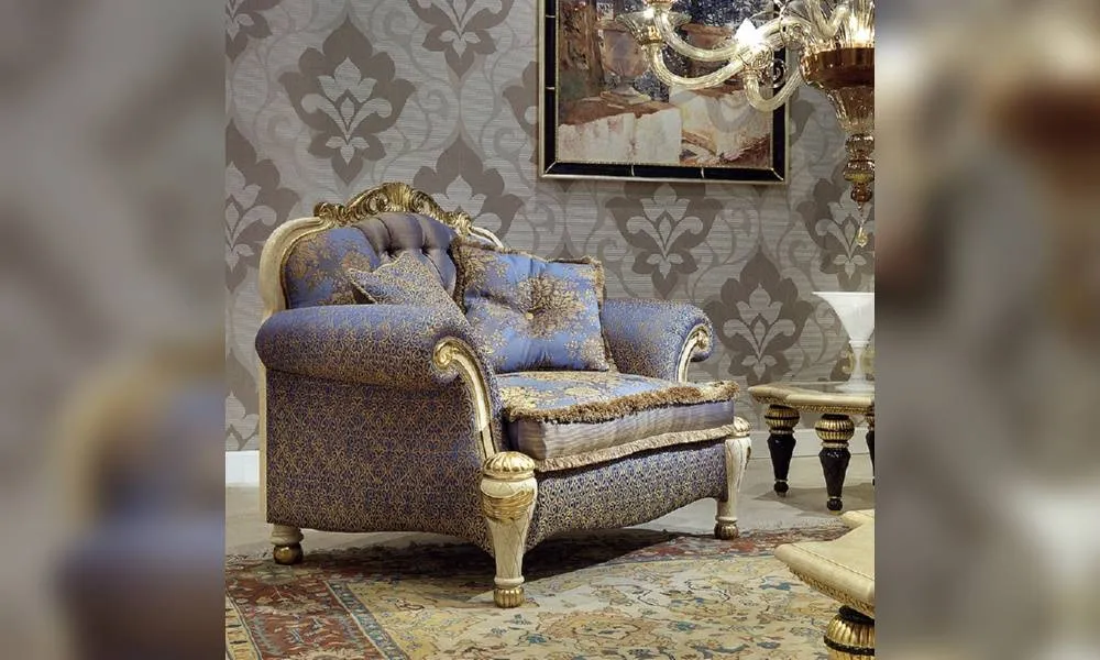 Кресло. Декорировано резными элементами. Возможны другие варианты отделки и обивки.