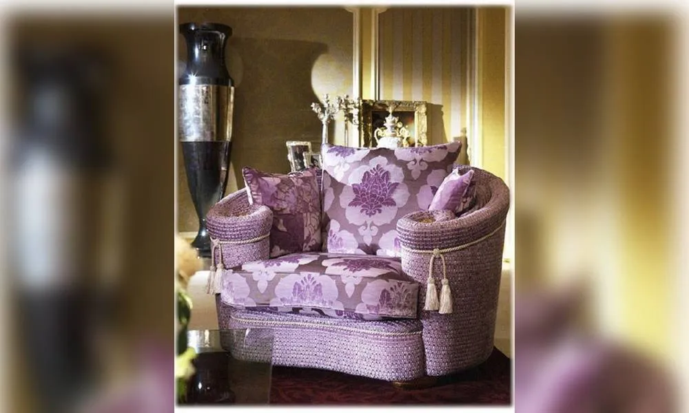 Кресло с закругленной спинкой плавно переходящей в подлокотники. Золоченые ножки. Наполнение - полиуретан. Декор ручной работы. Возможны другие цветовые варианты обивки.