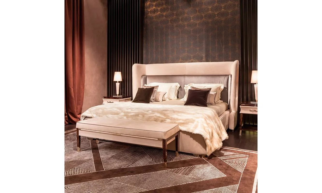 Кровать с мягким изогнутым изголовьем. Структура кровати - дерево. Возможны различные виды обивки и отделки.