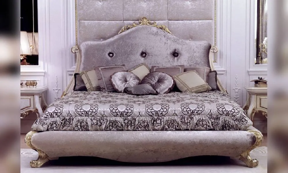 Двуспальная кровать. Деревянные ножки и рама изголовья украшены резьбой ручной работы. Изголовье обито в технике капитоне. Возможны другие варианты отделки и обивки.