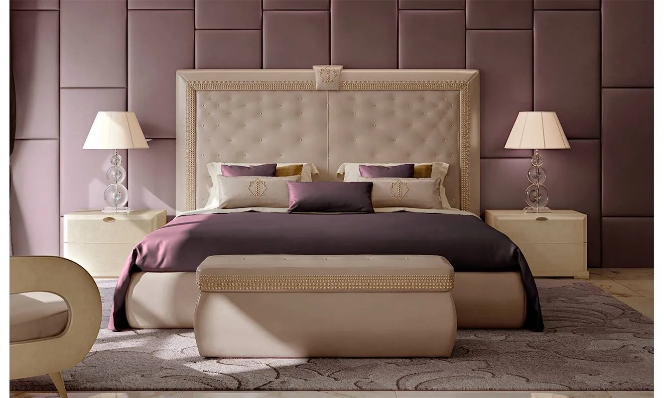 Кровать с мягким изголовьем, декорированным заклепками и кристаллами. Обивка может быть выполнена из ткани или кожи разных видов. Та кже возможен заказ кровати с хромированными металлическими деталями без наценки.