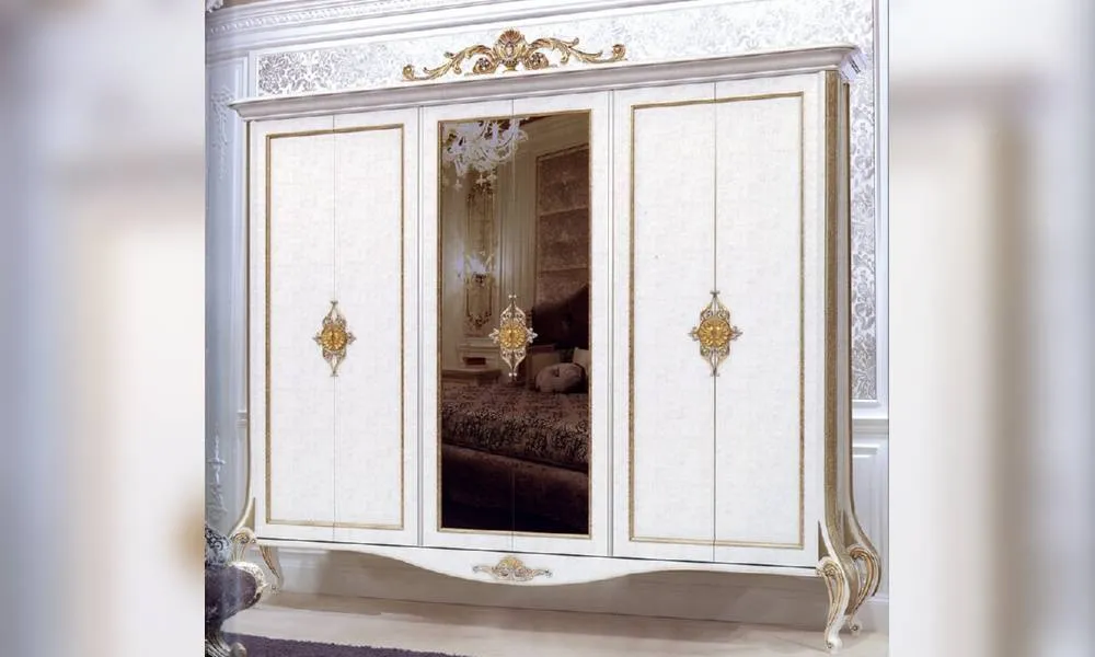 Шкаф с 4мя деревянными и 2мя зеркальными дверцами. Деревянная структура, декор ручной работы. Внутреннее оснащение: 3 деревянные полки и 3 вешалки золоченого цвета. Возможны другие варианты отделки.