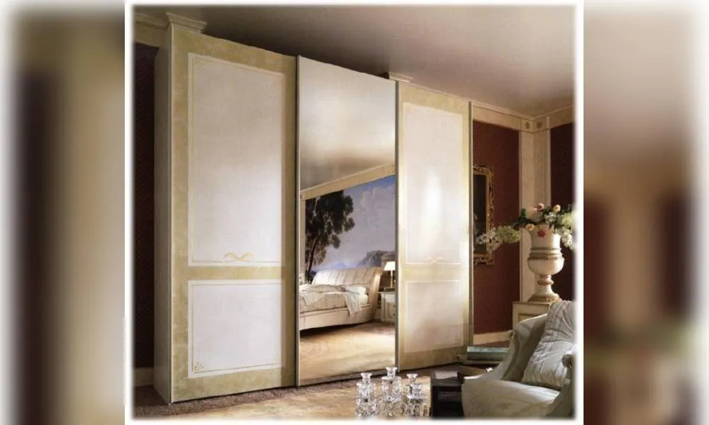 Шкаф с 3-мя раздвижными дверцами. Центральная дверца с зеркалом. По запросу возможно все 3 дверцы зеркальные или деревянные. Внутреннее оснащение: 3 полки и 4 золоченных вешалки. Декор ручной работы. Возможны другие цветовые варианты отделки.