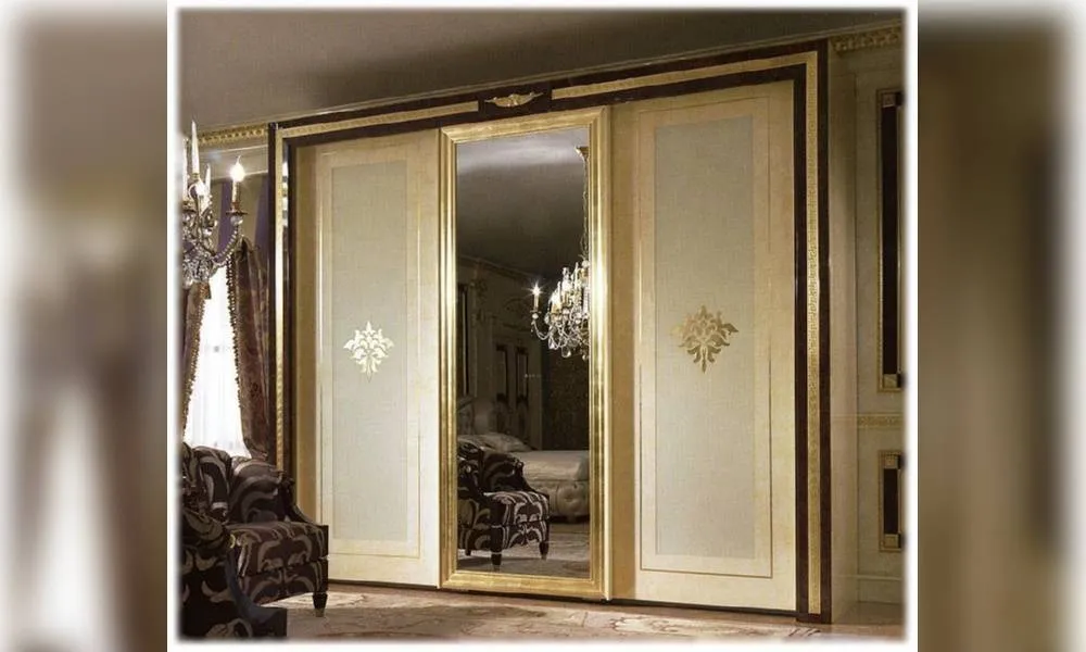 Шкаф с 3-мя раздвижными дверцами. Центральная дверца с зеркалом и боковые дверцы с окрашенным стеклом. Стекло украшено золотой фольгой. Внутреннее оснащение: 3 полки и 4 золоченных вешалки. Декор ручной работы. Возможны другие цветовые варианты отделки.