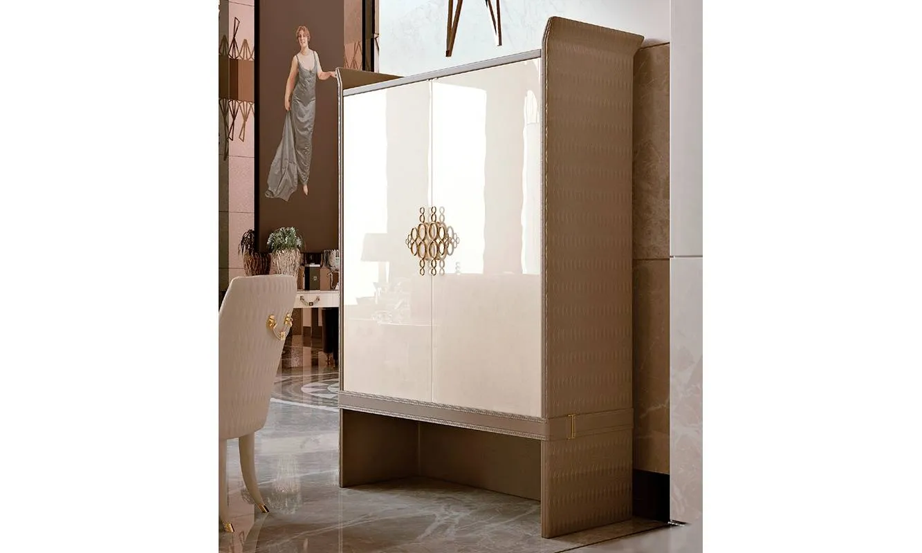 Шкаф с распашными дверцами, структура выполнена из дерева. Обит кожей, ручки металлические. Возможны другие варианты отделки и обивки.