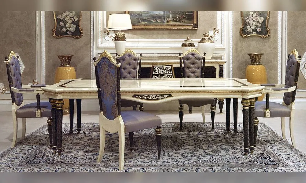 Стол прямоугольный. Декорирован резными элементами.
