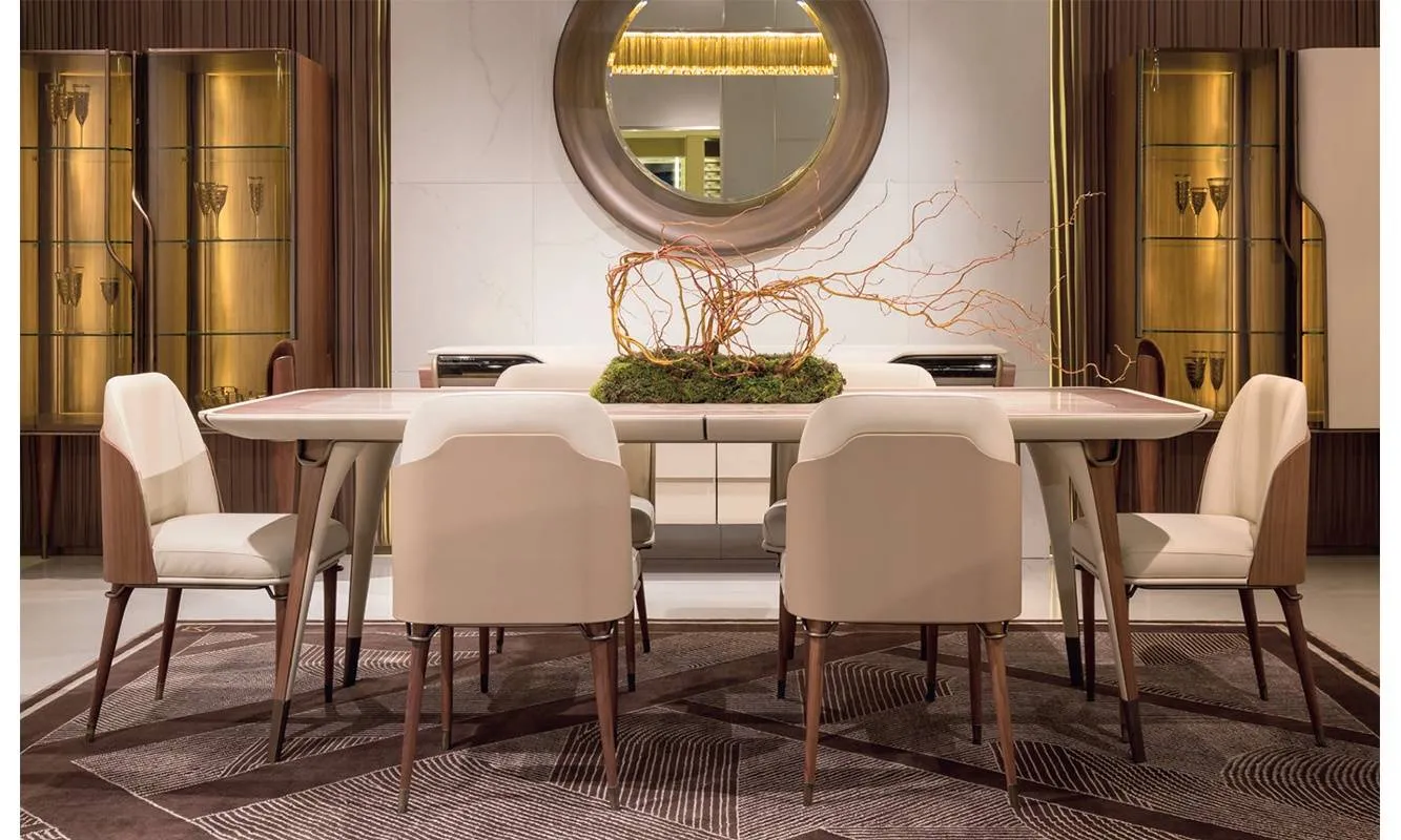 Обеденный стол с деревянной структурой в отделке из ореха Каналетто. На столешнице - вставка из мрамора. Декорирован кожаной аппликацией. Детали выполнены из сатинированного металла бронзового оттенка. Возможны несколько вариантов отделки и обивки.