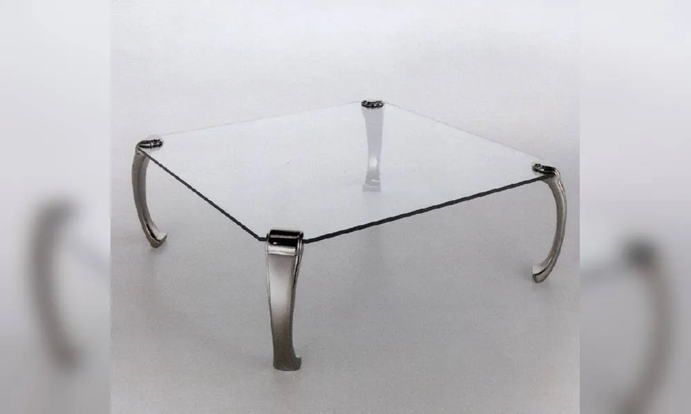 Квадратный журнальный столик со стеклянной столешницей и металлическими ножками.