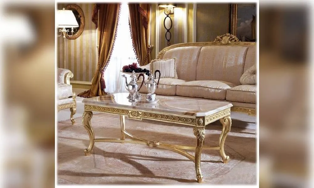 Журнальный столик. Каркас из букового дерева в отделке золотой фольги. Столешница из Португальского Розового мрамора. Декор ручной работы. Возможны другие цветовые варианты отделки.