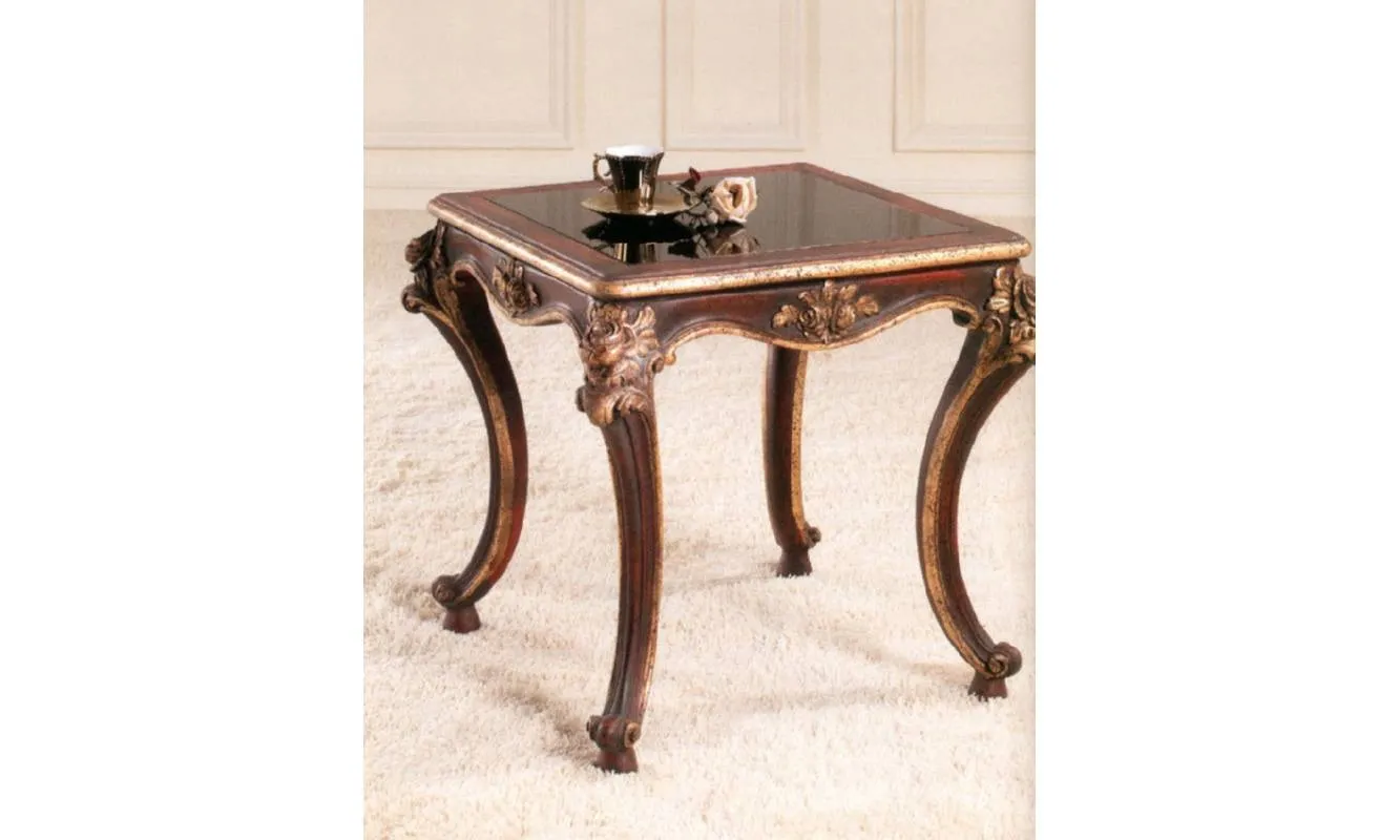 Приставной столик. Столешница выполнена из стекла. Декорирован резными элементами.