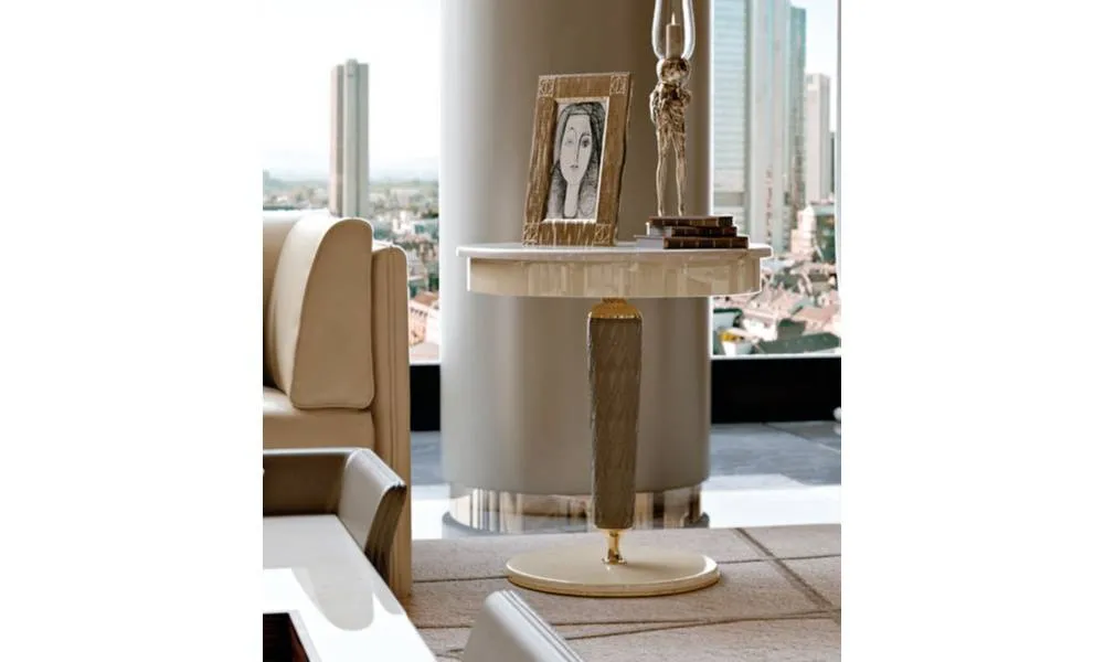 Столик со структурой из дерева, ножка обита в кожу. Декорирование выполнено вручную. Возможны другие виды отделки и обивки и заказ изделия с мраморным топом.