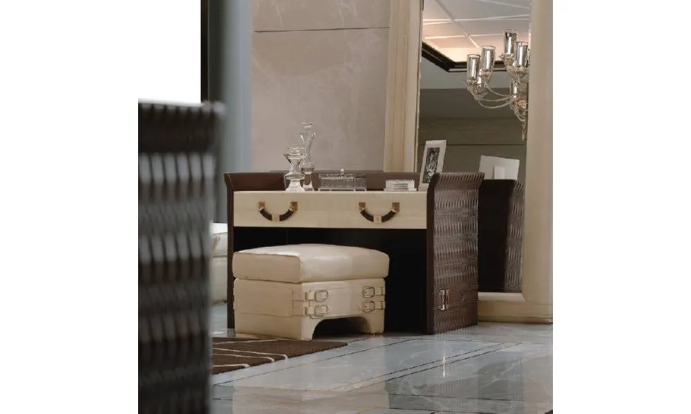 Туалетный столик с двумя ящиками. Структура выполнена из дерева с частичной кожаной обивкой. Возможен заказ изделия с мраморной столешницей и другие варианты отделки и обивки.