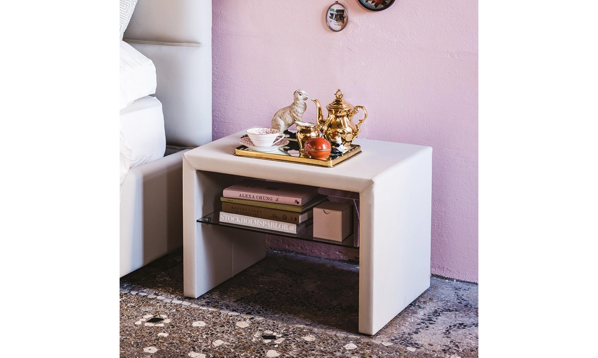 Тумба выполнена в отделке (кожа): leather 947 oyster.