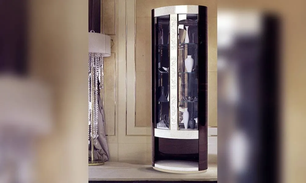Витрина с 1 распашной дверцей из закаленного стекла. Украшена декоративной резьбой ручной работы. Зеркальная задняя стенка. Рельефная часть в коже. Подсветка в верхней части возможна по запросу. Возможны другие варианты отделки.