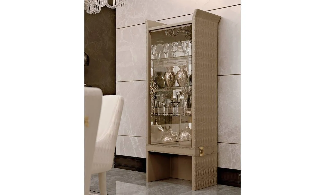 Витрина с дверцей из закаленного стекла и структурой из дерева. Обита кожей, ручка выполнена из металла. Возможен заказ витрины с подсветкой и другие виды отделки и обивки.