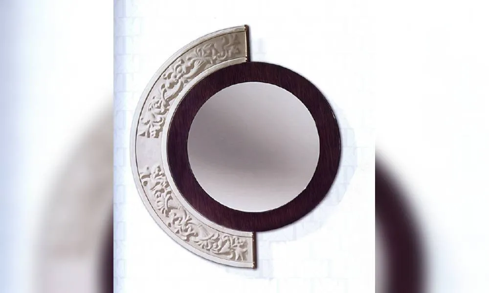 Круглое настенное зеркало. Деревянная рама украшена резьбой ручной работы. Рельефная часть в коже. Возможны другие варианты отделки.